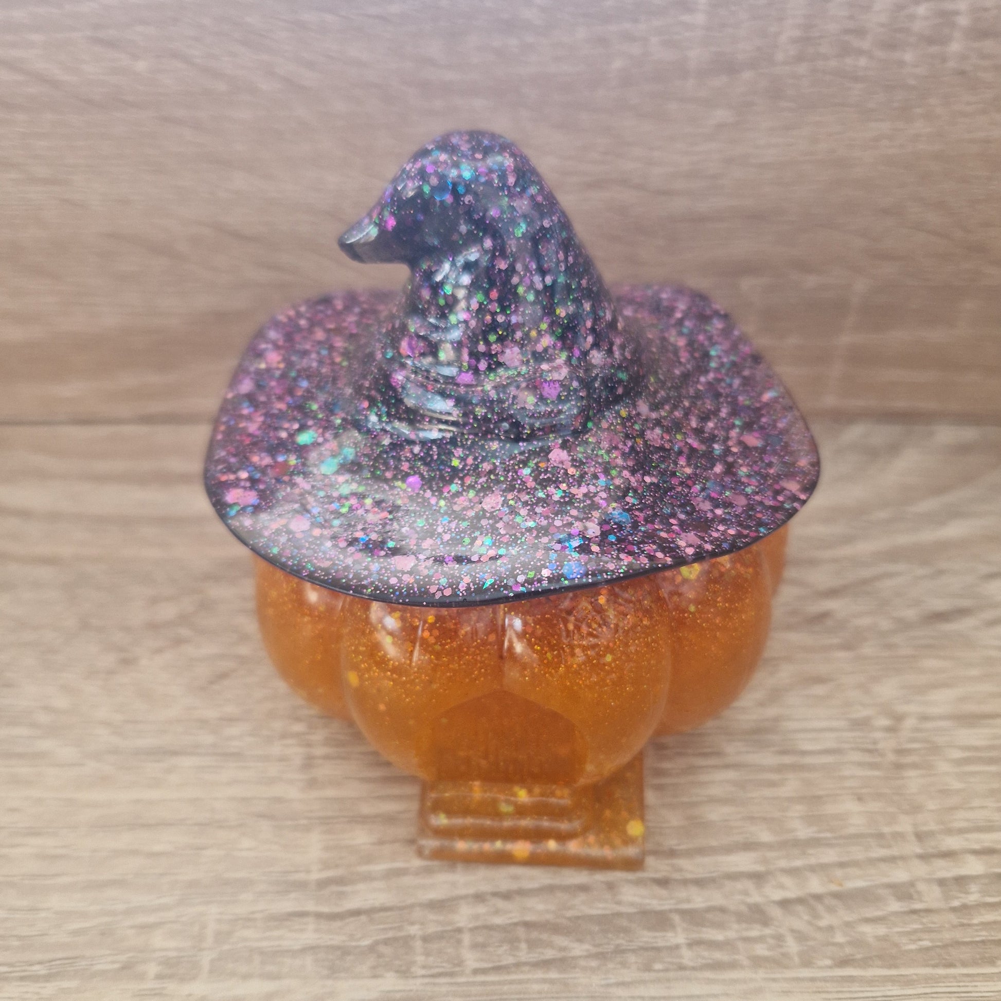 Boite citrouille orange à paillette et chapeau sorcière noir à paillette en Résine Epoxy